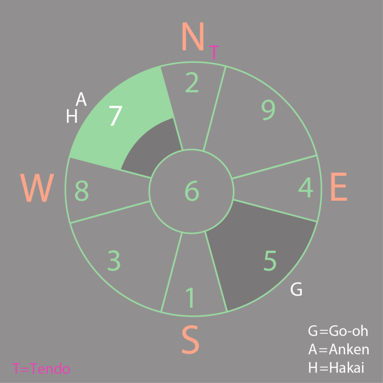 In April, Star #7 is positioned in the Northwest, the original domain of Star #6. This placement symbolizes achievements, justice, authority figures (father, superiors, husband), business, and service activities. However, please be aware that this position is currently influenced by both Anken Power and Hakai Power.