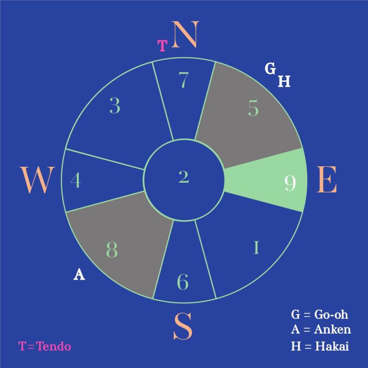 In August, Star #9 locates on East over Star #3’s original compass chart . And Star#9 locates over Star #2 on yearly compass chart.Star #9 has the Power of morning sun , development, and young people, children